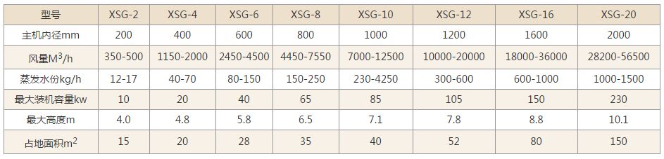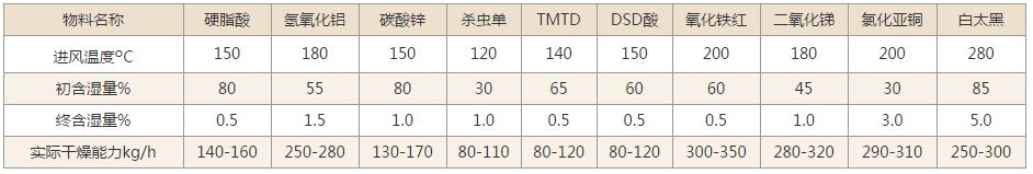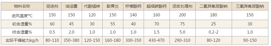 注:1.水分蒸發(fā)量是以進風(fēng)溫度為180oC,出風(fēng)溫度為80oC 時每小時蒸發(fā)的水份,